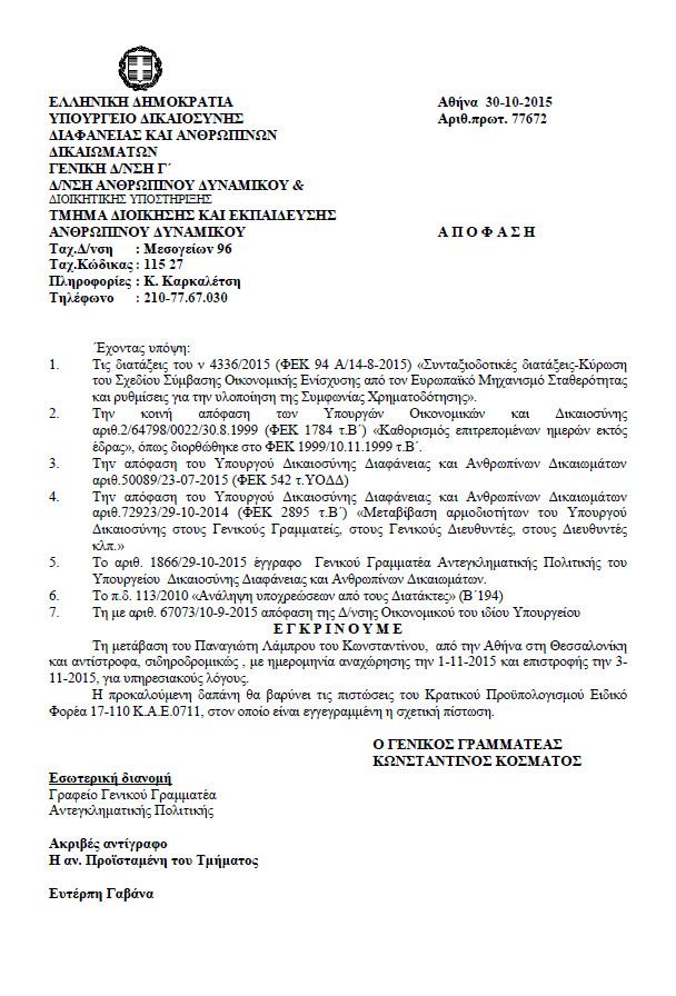 Σύμφωνα με το έγγραφο, που φέρει ημερομηνία 30/10, εγκρίθηκαν έξοδα μετακίνησης, για τον Π. Λάμπρου, για υπηρεσιακούς λόγους.