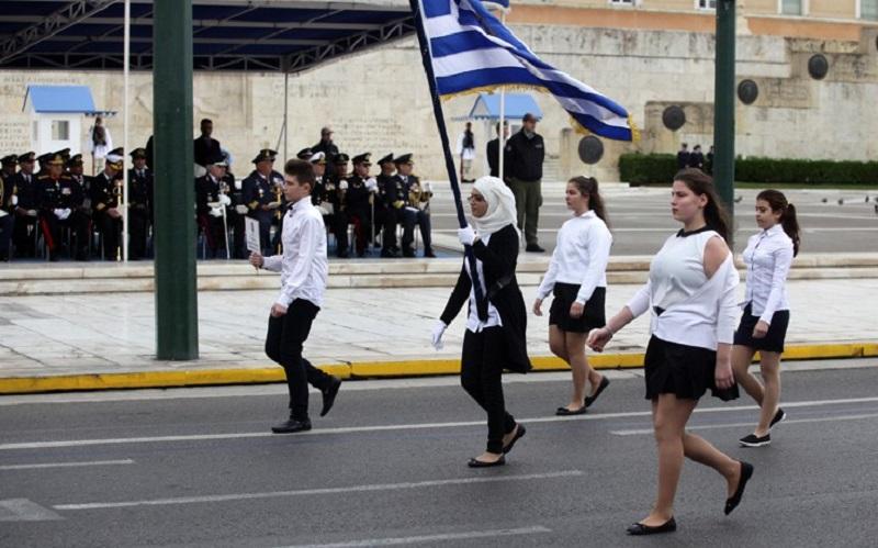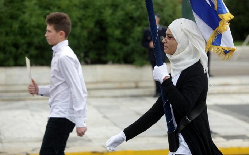 Η μαθήτρια με την μαντίλα, είναι Μουσουλμάνα. Είναι αριστούχος και δικαίως σηκώνει την Ελληνική σημαία. Τιμά τη χώρα μας με τη στάση της, και η χώρα μας τιμά τη μαθήτρια που την εμπιστεύτηκε να βαστήξει τη σημαία.