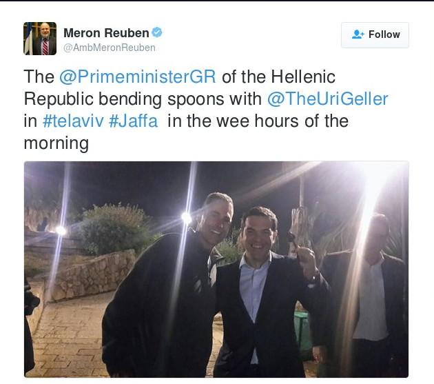 Η συγκεκριμένη φωτογραφία απεικονίζει τον Αλέξη Τσίπρα με τον Γιούρι Γκέλερ και τον Έλληνα πρωθυπουργό να κρατάει χαμογελαστός ένα κουτάλι. Το κείμενο με το οποίο επέλεξε ο Ισραηλινός αξιωματούχος να συνοδεύσει τη φωτογραφία αναφέρει «Ο Έλληνας Πρωθυπουργός με τον Γιούρι Γκέλερ λυγίζει κουτάλια τις πρώτες πρωινές ώρες στο Τελ Αβίβ».