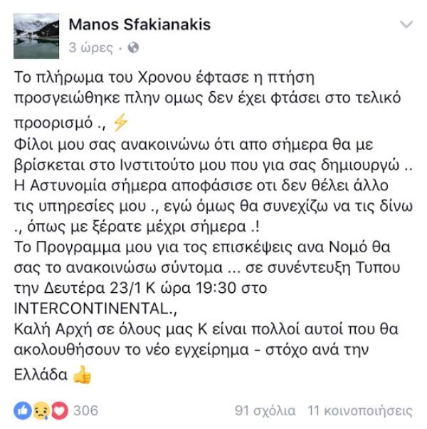 Το δικό του σχόλιο για την αποστρατεία του από την Αστυνομία έκανε ο Μανώλης Σφακιανάκης.