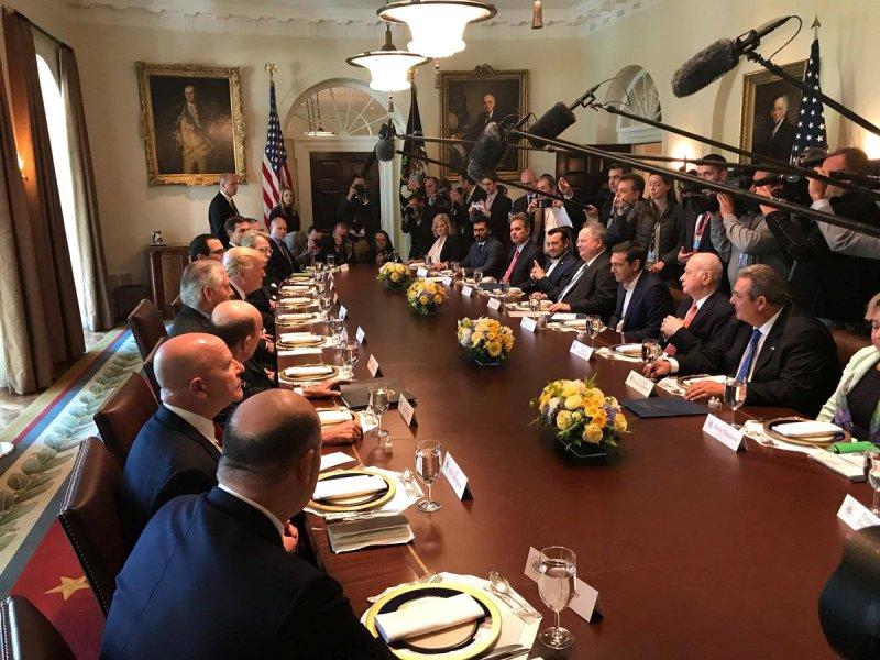 Σημειώνεται, δε, ότι ο Τραμπ εξήρε τις προσπάθειες της Ελλάδας για έξοδο από την κρίση και τόνισε ότι στη συνάντησή του με τον Έλληνα πρωθυπουργό θα συζητηθούν τρόποι για αμοιβαία βοήθεια μεταξύ των δύο χωρών, ενώ πραγματοποιήθηκε διευρυμένη σύσκεψη των αντιπροσωπειών ΗΠΑ και Ελλάδα, στην οποία συμμετείχαν εκτός από Τραμο και Τσίπρα, ο υπουργός Ψηφιακής Πολιτικής Νίκος Παππάς, ο υπουργός Εξωτερικών Νίκος Κοτζιάς, ο υπουργός Εθνικής Άμυνας, Πάνος Καμμένος, ο υπουργός Οικονομίας Δημήτρης Παπαδημητρίου, καθώς επίσης και ο επικεφαλής του Γραφείου ευρωπαϊκών και διεθνών σχέσεων του πρωθυπουργού Παναγιώτης Παυλόπουλος.