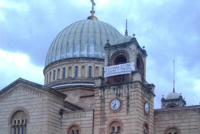Σε εκτενές κείμενο που ανάρτησε στο προσωπικό του ιστολόγιο, τον χαρακτηρίζει «άθεο και αντίχριστο» και κάνει λόγοα για εξαγωγή του αθειστικού φρονήματος. Στο μεταξύ, στην Παναγία Φανερωμένη στα Καλάβρυτα υπάρχει αναρτημένο στο καμπαναριό ένα πανό το οποίο που γράφει «Η Ελλάδα έγινε Σόδομα και Γόμορα».