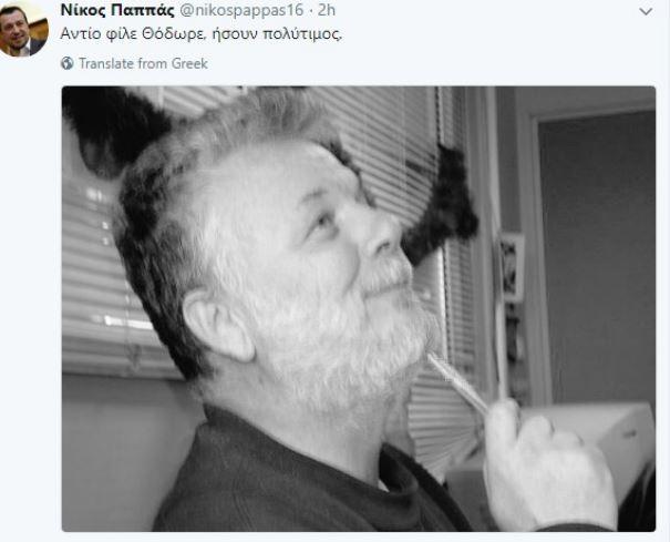 Σε ανάρτησή του στο twitter ο υπουργός Ψηφιακής Πολιτικής, Τηλεπικοινωνιών και Ενημέρωσης, Νίκος Παππάς, έγραψε για την απώλεια του Θοδωρή Μιχόπουλου: «Αντίο φίλε Θόδωρε, ήσουν πολύτιμος».