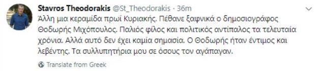 Τα συλλυπητήρια του για την απώλεια του Θοδωρή Μιχόπουλου εξέφρασε  με ανάρτησή του στο Τwitter ο επικεφαλής του Ποταμιού, Σταύρος Θεοδωράκης.