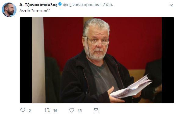 Με τη φράση «Αντίο “παππού”», σε ανάρτηση του στο twitter, ο υπουργός Επικρατείας και Κυβερνητικός Εκπρόσωπος Δημήτρης Τζανακόπουλος, αποχαιρετά τον δημοσιογράφο Θοδωρή Μιχόπουλο, ο οποίος είχε διατελέσει και επικεφαλής του γραφείου Τύπου του πρωθυπουργού Αλέξη Τσίπρα.