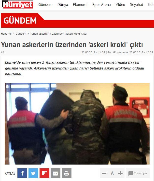 Ηurriyet – Anadolu: Βρέθηκαν στρατιωτικά σχεδιαγράμματα στο κινητό ενός εκ των δύο Ελλήνων