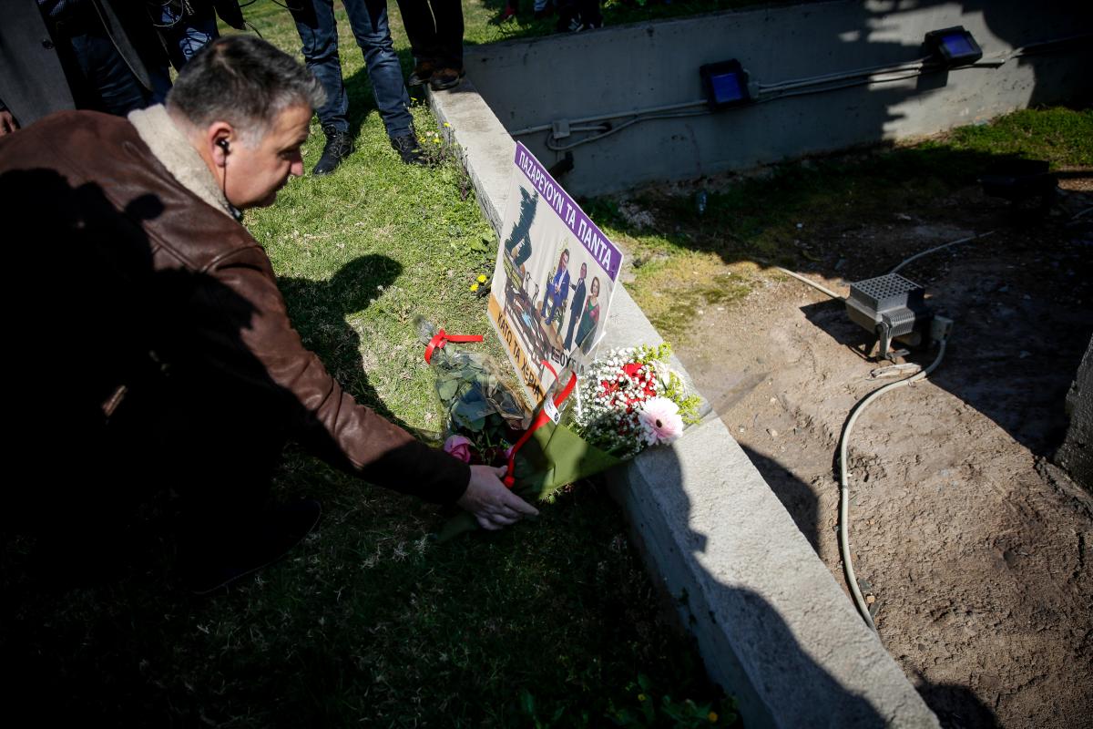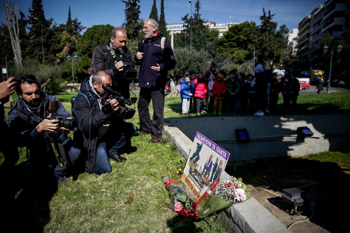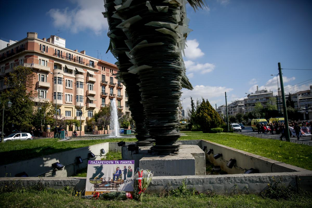 Όταν η συγκέντρωση έφτασε στη συμβολή των οδών Κηφισίας και βασιλίσσης Σοφίας, μέλη της Ένωσης απέθεσαν λουλούδια μπροστά στο γλυπτό, κατηγορώντας την κυβέρνηση ότι «παζαρεύει τα πάντα».