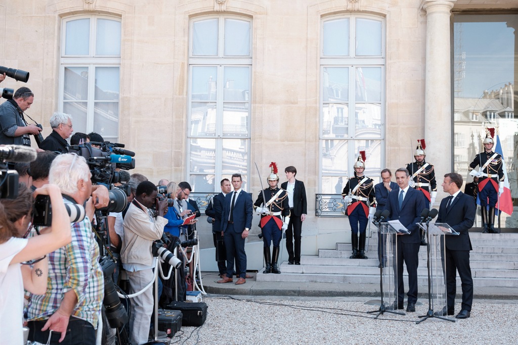«Μετά από δέκα χρόνια κρίσης η Ελλάδα μπαίνει σε τροχιά ανάπτυξης και διεκδικεί τη θέση της στην Ευρώπη που παραμένει ο φυσικός της χώρος», είπε ο πρωθυπουργός και πρόσθεσε: «Με τον πρόεδρο Μακρόν γνωριζόμαστε από την εποχή που ήταν υπουργός Οικονομίας. Έχω μεγάλες προσδοκίες για τη συνεργασία μας».