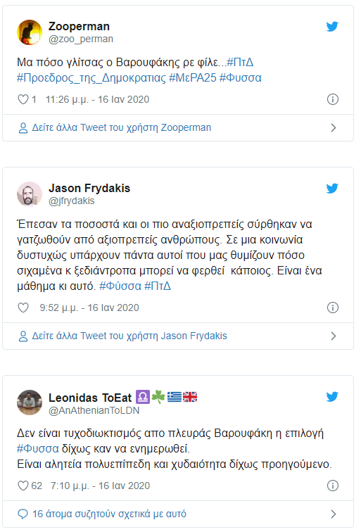 Στο στόχαστρο πολλών χρηστών του Twitter βρέθηκε ο επικεφαλής του ΜέΡΑ25 Γιάνης Βαρουφάκης, για το γεγονός ότι πρότεινε για πρόεδρο της Δημορκατίας την μητέρα του δολοφονημένου Παύλου Φύσσα, χωρίς πρώτα να την ενημερώσει.