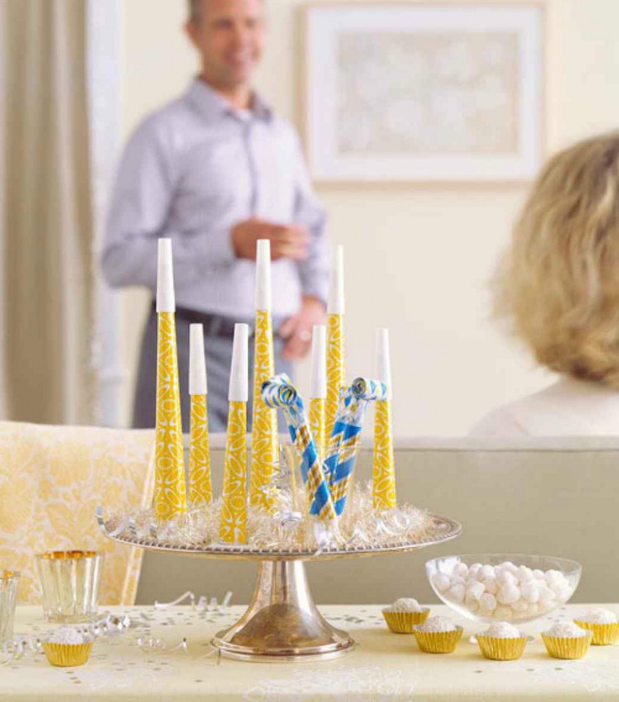 Χρησιμοποιήστε μια πιατέλα για κέικ και βάλτε πάνω τρομπετούλες που κάνουν θόρυβο. Στηρίξτε μέσα σε ένα γυάλινο ποτήρι τα αξεσουάρ που δεν στηρίζονται μόνα τους και ρίξτε από πάνω αστραφτερές πούλιες για έξτρα λάμψη. Όταν η ώρα κοντεύει 12 μοιράστε στους καλεσμένους σας από μια μίνι τρομπέτα.