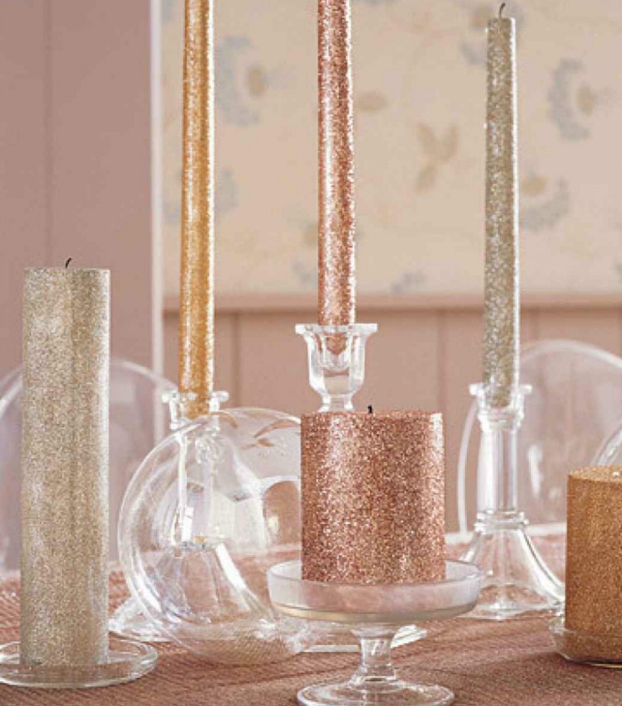 Μια μέρα πριν την πρωτοχρονιά φτιάξτε φανταστικά κεριά με γκλίτερ. Πάρτε απλά κεριά που έχετε σε διάφορα μεγέθη και σχέδια και βάλτε τα σε μια μεγάλη κούτα. Ψεκάστε τα με κόλλα ψεκασμού και ρίξτε από πάνω χρυσόσκονη ή ασημόσκονη. Μπορείτε να βρείτε κόλλα ψεκασμού σε καταστήματα με είδη χαρτικών.