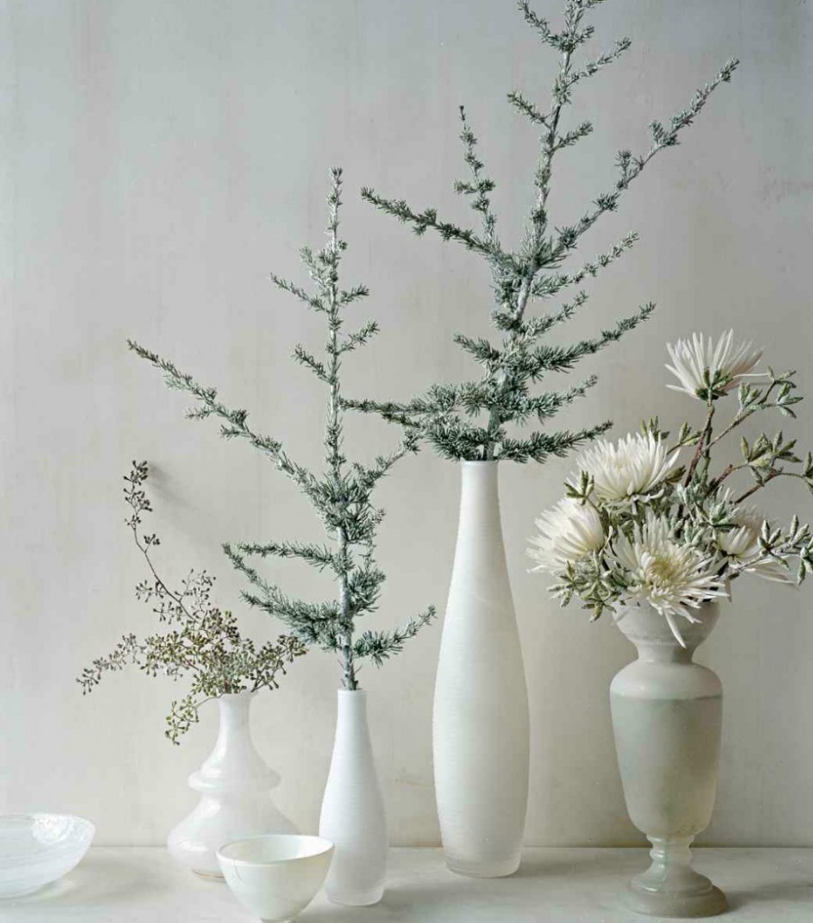 Χρησιμοποιήστε απλά λευκά βάζα σε διάφορα μεγέθη και τοποθετήστε σε αυτά λεβάντα ή ευκάλυπτο. Χρησιμοποιήστε ασημί σπρέι για να ψεκάσετε τα λουλούδια και να τους δώσετε έξτρα πρωτοχρονιάτικη λάμψη.