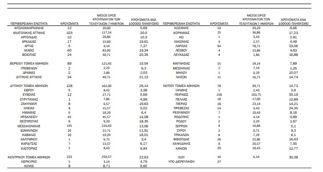Αναλυτικά για το Λεκανοπέδιο στην ανατολική Αττική εντοπίζονται 103 κρούσματα, στο Βόρειο Τομέα Αθηνών 89, στη Δυτική Αττική 34, στον Δυτικό Τομέα Αθηνών 128, στον Κεντρικό Τομέα Αθηνών 233, στον Νότιο Τομέα Αθηνών 78 και στον Πειραιά 158.